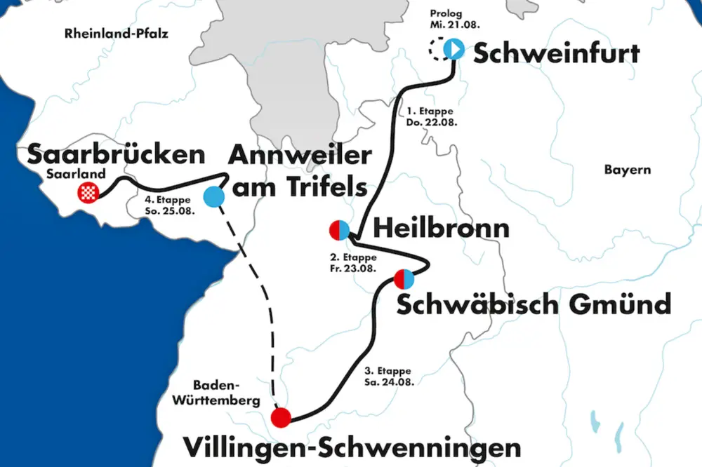 Schwäbisch Gmünd. Più semplice il finale della tappa successiva, con arrivo a Villingen-Schwenningen, nel Baden-Württemberg, ma dopo oltre 210 chilometri e 3000 metri di dislivello. Chiusura a Saarbrücken, sul confine francese, in un circuito finale con uno strappo di un chilometro al 6%.