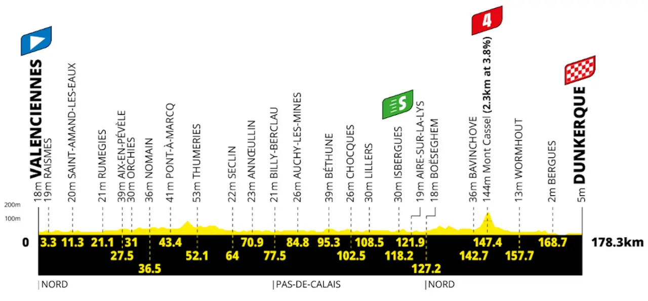 Al Tour de France 2025, il percorso della 3a tappa torna a sorridere alle ruote veloci, ma il finale potrebbe riservare qualche sorpresa. Il tracciato non riserva particolari difficoltà per 140 km, poi si torna sul Mont Cassel (da un versante diverso dal sabato) che ignorando il dato ufficiale si può misurare in 2.2 km al 4.5%, con punte al 7% e 400 metri di pavè. La vetta sarà a 30 km dal traguardo, dunque non lontanissima e l'avvicinamento al mare avviene su strade rettilinee pericolosissime se ci fosse vento nella giusta direzione. A parte questo rimane una tappa assolutamente per velocisti con un finale molto veloce: l'unica curva a destra si trova a 1.5 km dall'arrivo, i quali sono mossi da qualche semicurva che nasconde il traguardo alla vista fino agli ultimi metri.