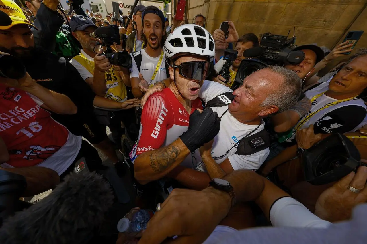 Fora in un momento molto scomodo l’eroe della tappa di ieri, Mark Cavendish (Astana Qazaqstan), che si ritrova ad inseguire il gruppo lanciatissimo e a litigare con i giudici di gara, probabilmente per un rientro ritenuto irregolare al seguito dell’ammiraglia della propria squadra.
