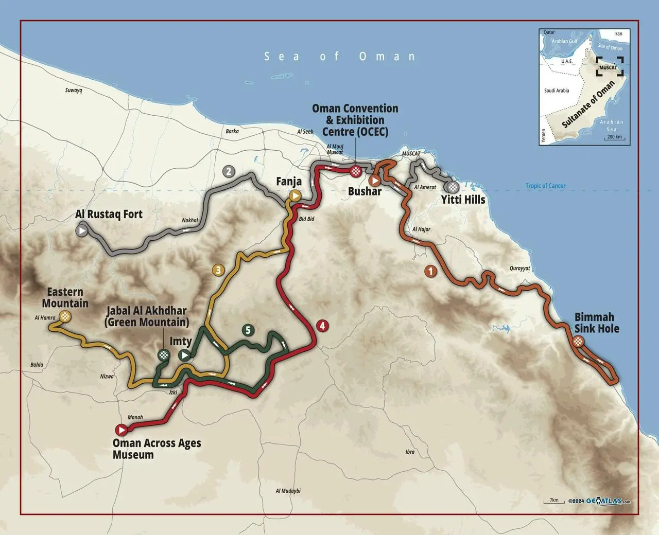 In Oman si ripropongono più o meno gli stessi percorsi compreso l'appuntamento con la Muscat Classic alla vigilia; in 6 giorni soltanto un paio di volate e tante salite di varia tipologia