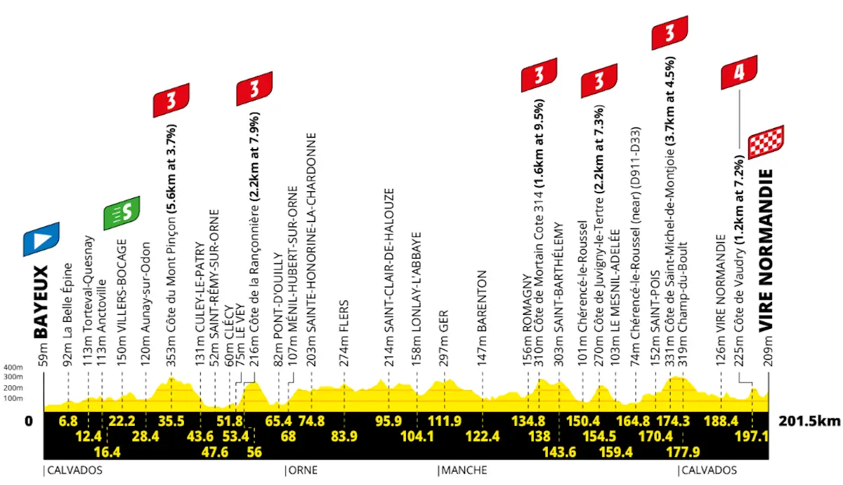 Al Tour de France 2025 servono ancora occhi aperti per gli uomini di classifica, per una 6a tappa lunga ed esigente dove potrebbe ancora succedere qualcosa. Le salite sono più lunghe rispetto alle altre due tappe mosse già percorse, ma sono un po' più disperse lungo il percorso, con un finale invece leggermente più agevole. Va anche detto che alcune delle asperità più impegnative sono già nei primi km, quindi sarà una tappa estremamente dispendiosa fin dalla partenza. Ufficialmente sono segnalati 3550 metri di dislivello, ma forse è più ragionevole credere che questo sia inferiore a 3000. Dopo 30 km mossi da piccole ondulazioni, si sale la Côte du Mont Pinçon (5.6 km al 3.7%, divisi a metà da un tratto in discesa, max 9%); poco più avanti si incontra la dura Côte de la Rançonnière (ignorando il dato ufficiale, 2.5 km al 7.5%, max 15%; seguita da altri 2 km in lieve ascesa). Non c'è GPM, ma spicca senz'altro anche la salita verso la Batonnière (4.3 km al 4%). I successivi 60 km sono un continuo su e giù - si segnala una salita più lunga a Ger (2.7 km al 4.3%) - che precedono la fase più impegnativa della tappa: si incontra a 63.5 km dall'arrivo la durissima Côte de Mortain (ignorando il dato ufficiale, 1.7 km al 9.8%, max 13%), seguita poco dopo dalla salitella di Saint-Barthélemy (circa 2 km al 3%, max 10%). Dopo una lunga discesa si sale la Côte de Juvigny-le-Tertre (2.2 km al 7.3%, max 10%), che termina a 47 km dal traguardo. Una salitella di 2.8 km al 3.5% (5/6% spezzato da una breve discesa) precede la Côte de Saint-Michel de Montjoie (3.7 km al 4.5%; dopo 800 metri al 6% con punte al 10% si incontrano 600 metri in lieve discesa, prima della vera salita di 2.5 km di al 5.5%, max 9%) che termina a 27 km dall'arrivo. Dalla vetta si arriva a Vire con una quindicina di km ondulati prevalentemente in discesa; nel centro cittadino si affronta una salita di 1.3 km al 3.5% (max 8%) fino a Porte-Horloge, poi con 5 km pianeggianti si arriva ai piedi della determinante Côte de Vaudry (1.2 km al 7.2%, max 11%) che termina ad appena 4.4 km dall'arrivo. La discesa anche stavolta inizia dopo alcuni metri di falsopiano e termina a 2.3 km dal traguardo; sono di nuovo in salita gli ultimi 700 metri al 10.2% (max 14%).