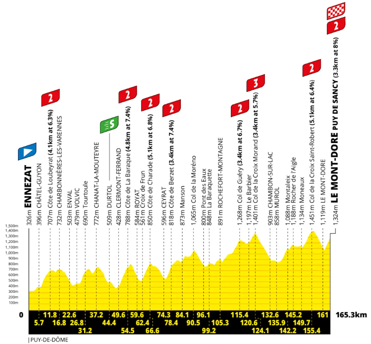 Il Massiccio centrale offre il terreno per la prima frazione (quasi) di montagna del Tour de France 2025, che in 165.3 km accumula almeno 4000 metri di dislivello (stavolta il dato ufficiale è meno esagerato dei giorni precedenti) pur senza mai affrontare salite particolarmente lunghe. La maggiore difficoltà della 10a tappa sarà data dalla totale assenza di pianura che potrebbe dar vita ad una corsa altamente spettacolare fin dalla partenza e particolarmente selettiva, anche se i più forti probabilmente non riusciranno a staccarsi se non nella rampa finale verso il traguardo. La strada inizia a salire verso Chatel-Guyon (1.2 km al 5%) dopo appena 3 km, antipasto alla dura Côte de Loubeyrat (4.1 km al 6.3%, con una rampa iniziale di 600 metri al 13%, max 18%), seguita anche dalla salitella di Charbonnières-les-Varennes (1.6 km al 4.1%); tosta è anche la salita a Tourtoule (4.2 km al 6%, con un tratto di circa 1.5 km al 10%), seguita da quella più semplice a Chanat-la-Mouteyre (2.2 km al 5.7%). Scesi a Clermont-Ferrand si sale la Côte de la Baraque (4.8 km al 7.4%, max 9%; seguita da 1.5 km in falsopiano), sfiorando il Puy de Dome, immediatamente seguita dalla Côte de Charade (5.1 km al 6.8%, max 9%) e dalla Côte de Berzet (3.4 km al 7.4%, tratto di circa 2.5 km al 9%, max 11%). Finisce qui una prima sequenza di salite piuttosto ripide, che, entrando nelle montagne, viene sostituita da un percorso sempre nervoso ma con salite mediamente più lunghe e pedalabili. La stessa Côte de Berzet è in verità il tratto più duro della lunga ascesa al Col de la Moreno (in tutto 15.5 km al 3.2%; in vetta il valico si raggiunge in 1.6 km al 6%, max 9%). Al termine della discesa, le salitelle di La Baraquette (1.5 km al 4.2%) e Saint-Martin (1.3 km al 6%, max 10%) precedono il Col de Guery: in tutto sono 9.6 km al 4.3%, composti da 3.5 km al 4.2%, 2 km abbondanti di falsopiano e un tratto finale di 3.7 km al 6.7% (max 9%). Segue subito dopo la salita al Col de la Croix Morand (3.4 km al 5.7%, max 7%). Una lunga discesa consente di respirare per una dozzina di km, ma poco dopo Murol (700 mt al 4%) si incontrano le prime rampe della salita al Col de la Croix Saint-Robert (in tutto 17 km al 3.4%): si inizia con la dura salita verso Montaleix (3.3 km al 7%, max 11%), seguita da quella a Rocher de l'Aigle (2.3 km al 5.3%, primo km al 9%, max 11%); 5 km di lieve discesa spezzati da un paio di zampellotti (max 8%), portano ai piedi degli ultimi 5.5 km al 6% (max 8%). Lo scollinamento avviene a soli 9.9 km dal traguardo, quindi già qui potrebbe forse succedere qualcosa, anche perché al termine della discesa inizia subito la salita verso il traguardo ai piedi del Puy de Sancy di 3.3 km all'8%, con punte fino al 13% nei primi 500 metri.