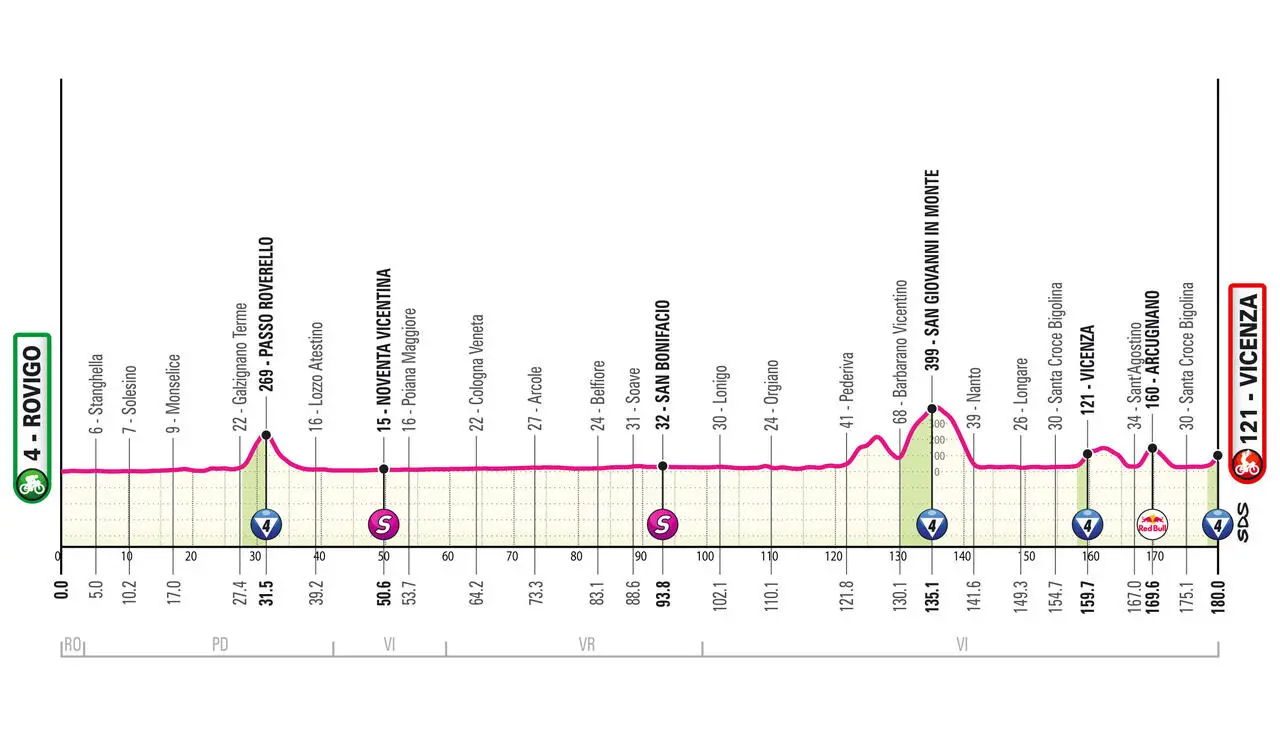Al Giro d'Italia 2025 torna una frazione insidiosa in cui tenere gli occhi aperti, ma non tremendamente difficile. In avvio della 13a tappa si lambiscono i Colli Euganei, salendo dopo una trentina di km il tosto Passo Roverello (più dura del dato ufficiale: 4.1 km al 7.1%, max 12%), ma per le fasi decisive tutto è rimandato al finale, visto che servono 80 km perfettamente pianeggianti per arrivare ai piedi dei Colli Berici e incontrare di nuovo un po' di pendenza: si sale a Pozzolo (1.1 km all'8.3%, max 13%), Garzola (600 mt al 9%, max 14%) e soprattutto al GPM di San Giovanni in Monte, salita lunga ed impegnativa (5 km al 6.7%), con un primo tratto di quasi 3 km all'8.5% (max 13%). Tuttavia da fine discesa (tecnica e ripida) mancano ancora 38.4 km all'arrivo e ne servono 17 prima di tornare a salire, quindi difficilmente succederà qualcosa di importante: potrebbe però essere un momento decisivo se la tappa se la giocasse la fuga del mattino. Per gli ultimi km tutto è affidato al doppio passaggio su Monte Berico (1.1 km al 7.5%, max 12%), in vetta al quale è posto il traguardo, ma anche allo strappo di Arcugnano (1.6 km al 7.7%, max 13%) che assegna abbuoni quando mancano soltanto 10.4 km all'arrivo. Dalla fine della discesa bastano 6 km per imboccare di nuovo lo strappo finale.