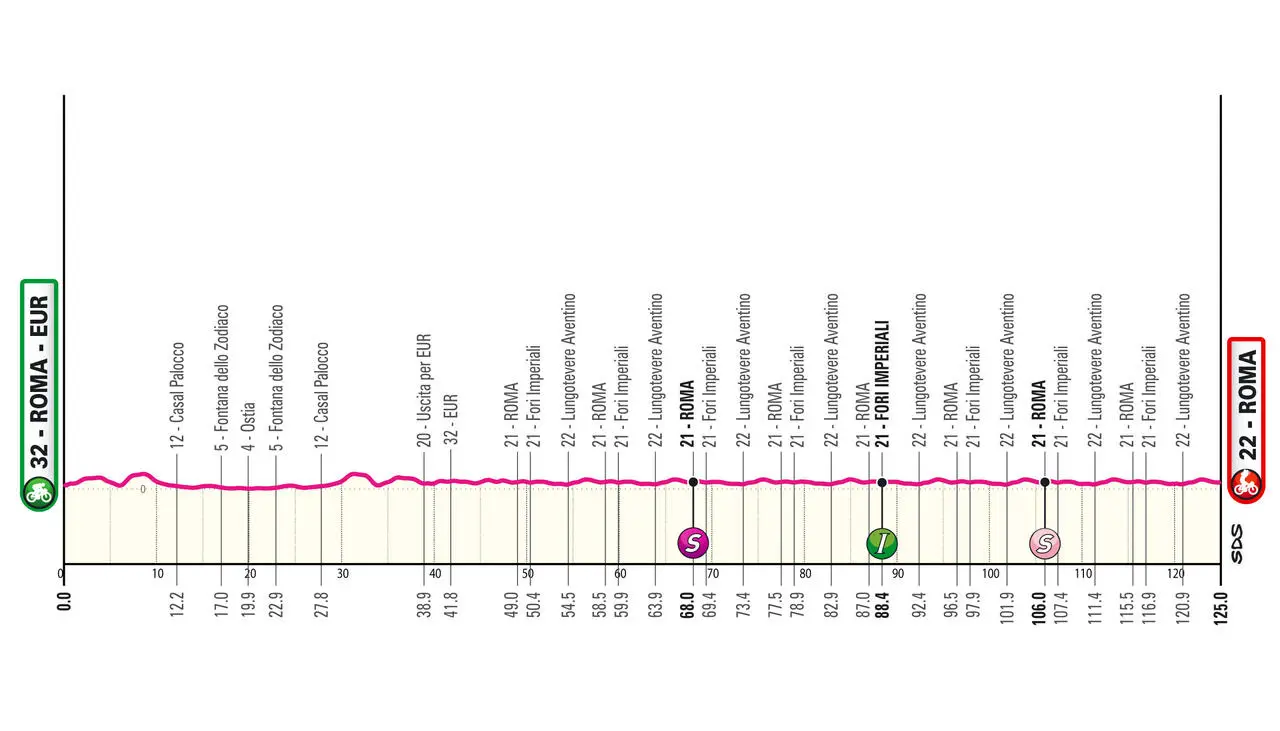 Il Giro d'Italia sta per finire (anzi, di fatto è chiuso), ma rimane ancora l'affascinante chiusura per le strade della Città Eterna. La tappa prende il via dal quartiere EUR e nella prima parte percorre andata e ritorno Via Cristoforo Colombo per raggiungere il Lido di Ostia e tornare in centro transitando nuovamente dalla zona del via. A questo punto si transita sul traguardo - spostato dai Fori Imperiali a via San Gregorio per assenza di spazi a causa dei lavori alla MetroC - ed inizia il circuito finale di 9.5 km da ripetere 8 volte. Il circuito è abbastanza simile allo scorso anno, ma leggermente più breve e lineare: dopo aver fiancheggiato il Colosseo e percorso i Fori Imperiali, si raggiunge il Lungotevere, che si percorre verso sud fino al Circo Massimo; quindi si percorre un anello intorno alle Terme di Caracalla (con un tratto in lieve ascesa a 2 km dall'arrivo), per immettersi su via San Gregorio a 350 metri dal traguardo. Da segnalare che ad ogni giro si percorre un totale di quasi 1 km su sanpietrini, tra cui il rettilineo di arrivo medesimo.