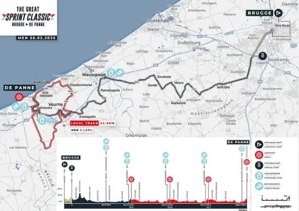 La campagna del Nord inizia a definire la sua fisionomia con tre corse di fine marzo in rapida successione ovvero Classic Brugge - De Panne, E3 Saxo Bank Classic e Gand-Wevelgem, prima di un aprile ancora più intenso. La prima di queste corse andrà di scena domani nelle vicinanze della costa belga. È ufficialmente la 49° edizione della Classic Brugge – De Panne che fino a cinque anni fa si disputava nell'arco di tre giorni e la cui denominazione più nota è stata Driedaagse Brugge-De Panne ovvero Tre Giorni di La Panne. Dal 2021 è diventata dunque corsa di un giorno ed è 'preda' dei velocisti, presentando un percorso completamente pianeggiante. Dopo la partenza da Bruges i ciclisti si dirigeranno verso ovest fino all'entrata nel circuito di De Panne al km 110, che si dovrà ripetere due volte. In particolare si affronterà in tre occasioni il De Moeren, uno dei tratti fiamminghi più battuti dal vento. Vento che nelle previsioni di domani sembra però piuttosto debole. La semiclassica fiamminga è lunga complessivamente 195.6 km. Gli ultimi vincitori, da quando è diventata corsa di un giorno, sono stati nell'ordine Sam Bennett, Tim Merlier e due volte Jasper Philipsen.