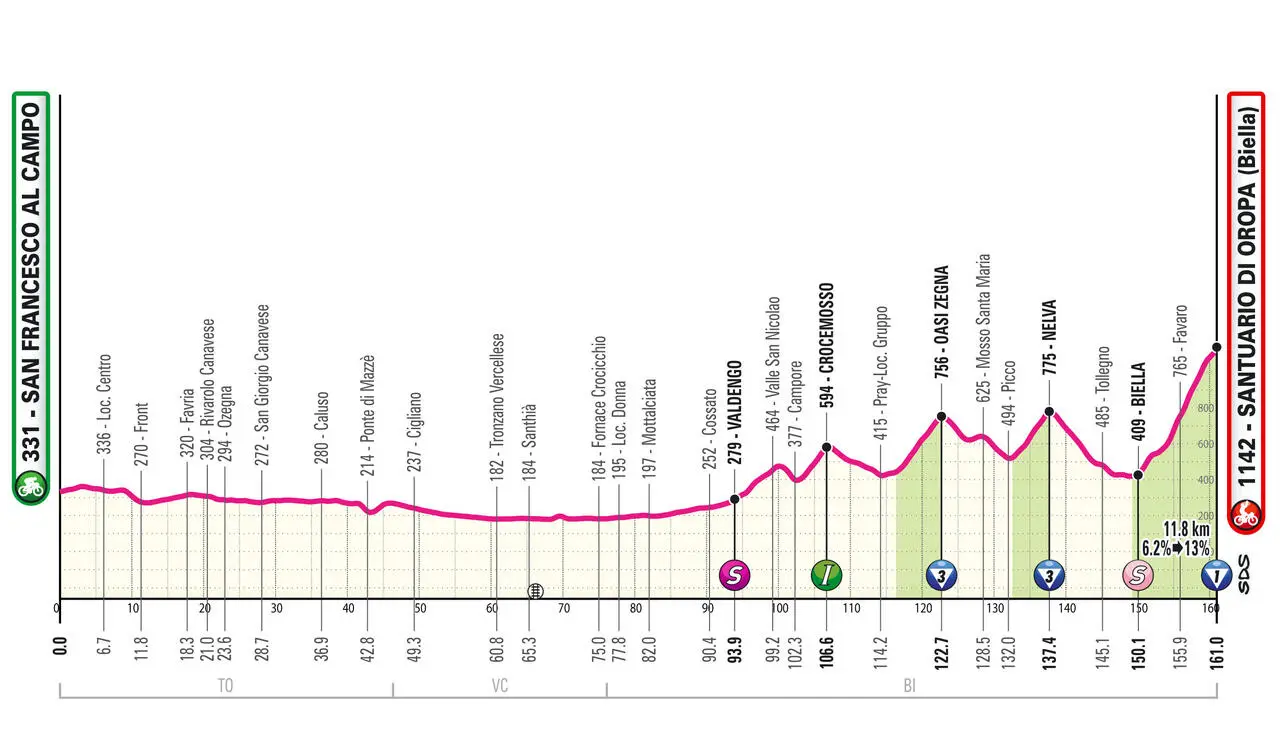 Dopo una prima tappa già impegnativa e corsa al fulmicotone, domani il gruppo potrà nuovamente fare scintille sul primo vero arrivo in salita del Giro d'Italia che potrebbe condizionare fortemente la classifica. La salita da Biella al Santuario di Oropa è un classico del Giro e presenta le pendenze giuste per scavare qualche distacco, tanto più che sarà preceduta da altre asperità anche se non durissime. Dopo oltre 90 km fondamentalmente pianeggianti, gli ultimi 70 scarsi bastano per accumulare rapidamente quasi 2000 metri di dislivello. La strada inizia a salire dopo il traguardo volante di Valdengo per raggiungere Valle San Nicolao in circa 6.5 km al 3.5%. Da adesso in poi si susseguono salite e discese su strade complicate e tortuose senz'altro difficili da interpretare anche se la corsa avrà il suo punto focale nella salita conclusiva; nell'ordine si sale all'Intergiro di Crocemosso (4.3 km al 5.1%), a Lora (5.5 km al 5.6%) - dove è posto il GPM di Oasi Zegna - e Nelva (5 km al 5.7%, abbastanza irregolare, max 12%). Un'ultima discesa porta ad Andorno Micca, dove in pochi km di fondovalle si arriva a Biella per imboccare subito l'ascesa conclusiva di 11.8 km al 6.2% di media: i primi 5 km sono abbastanza semplici (media 3.9%) eccetto un primo strappo di circa 1.5 km al 6%; poi la strada impenna per entrare nel centro di Favaro e procede a gradoni fino al traguardo alternando lunghi tratti in doppia cifra a brevi momenti di respiro (gli ultimi 6.8 km hanno una media del 7.9% e punte fino al 14%).
