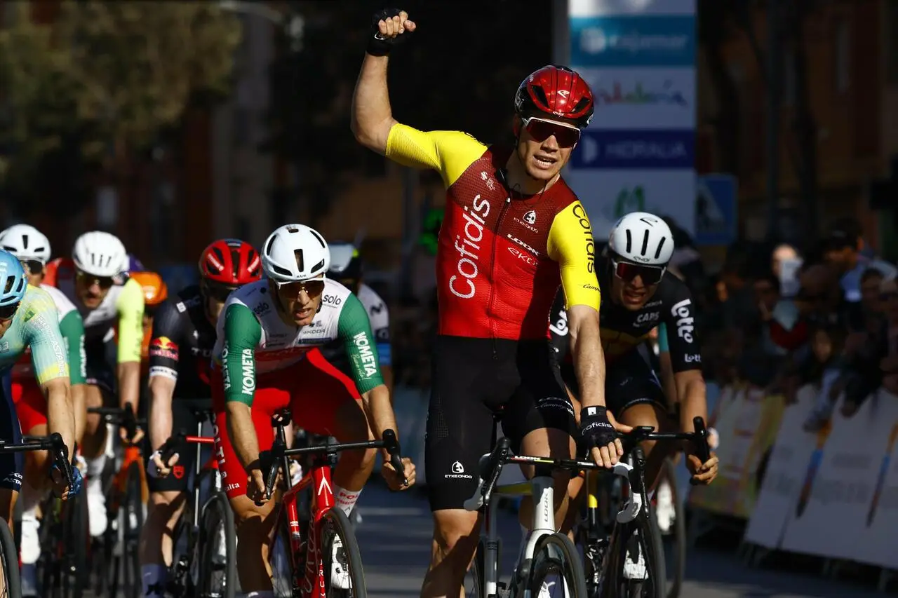 A questo punto, non c'è più terreno per fare la differenza: andatura sostenuta nell'ultimo tratto in discesa che precede il gran finale. Soudal-Quick Step e Lidl-Trek scortano il gruppo fino agli ultimi 500 metri. A metà della rampa finale, entra in azione l'eritreo Biniam Girmay (Intermarché-Wanty): il suo spunto, però, non è quello buono. Alla sua sinistra avanzano nell'ordine i belgi Arnaud De Lie (Lotto), Wout van Aert (Visma) e Milan Fretin (Cofidis), seguiti a loro volta dall'italiano Alberto Dainese (Tudor) che, tuttavia, è costretto a defilarsi per un problema meccanico negli ultimi 200 metri. De Lie è ancora in testa ai 150 metri, ma il tempismo del velocista della Cofidis è perfetto: la rimonta dell'altro belga Jordi Meeus (Red Bull-BORA-Hansgrohe) e dell'italiano Filippo Ganna (INEOS Grenadiers) resta nel libro delle buone intenzioni. 2° successo stagionale (il 4° della carriera) per il 23enne fiammingo a pochi giorni dal blitz alla Clásica de Almería. Nella prima pagina della classifica anche l'altro azzurro Nicolò Buratti (Bahrain), 8°.