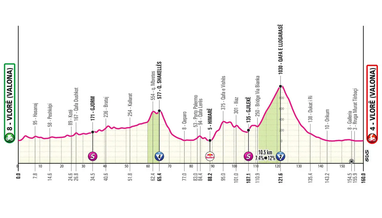 Se già le prime due giornate del Giro d'Italia 2025 non hanno risparmiato al gruppo numerose difficoltà, la 3a tappa è ancora più insidiosa, quasi forse da essere considerata la prima frazione di montagna e non solo per la lunga ascesa al Passo di Logara a ridosso degli ultimi km. In 160 km si totalizzano 2800 metri di dislivello (di fatto tutti concentrati nei primi 120 km), certamente non pochi, con salite spesso ripide anche se relativamente brevi, in numero molto maggiore rispetto a quanto facciano immaginare i soli due GPM in palio. La partenza è di fatto già in salita (si incontra quasi subito una salita di 2 km al 4.5% per uscire da Valona) e il successivo fondovalle è zeppo di ondulazioni anche piuttosto esigenti per almeno 45 km; poi diventa un più gestibile falsopiano che conduce ai piedi della prima vera salita di Qafa Shakellës: in tutto sono 5.4 km al 4.2%, ma in verità è composta da un primo duro segmento di 2 km al 9.7% (max 14%) e da un secondo strappo di circa 1 km all'8%, separati da una sensibile contropendenza; dunque salita vera, che fa male. Dopo una lunga discesa si arriva sul mare, ma per costeggiarla si risale subito in quota, prima con il semplice Qafa Lerës (2.6 km al 3.1%), poi con il tostissimo Qafa e Vishës (5 km al 7.1%, ma molto irregolari; si segnala un tratto di 600 metri al 15% di media, max 17%), a sua volta seguito da altre ondulazioni come quelle di Iliaz (1 km al 7%) e Palasë (1.9 km al 7.7%). Già fin qui c'è stato tanto terreno per fare selezione, eppure manca ancora la vera salita del giorno, il Qafa e Llogarasë (10.5 km al 7.4%, max 12%) ascesa per scalatori che ha il solo difetto di essere piuttosto distante dal traguardo, ma nemmeno tantissimo (38.6 km), anche perché almeno 13 sono di vera discesa, seguiti da una decina di falsopiano molto veloce. Ammazzano la fantasia gli ultimi 17 km lungomare, che comunque offrono qualche piccola ondulazione, in particolare uno zampellotto di 300 metri al 7% a 6.5 km dall'arrivo. Il finale è pianeggiante e molto lineare, con una sola rotonda a ostacolare la marcia quando mancano 1200 metri.