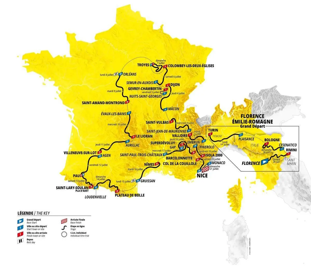 Se i giochi fossero ancora aperti, tutto si decide con questa spettacolare cronometro tra Monaco e Nizza, dove anche il successo di tappa dovrebbe essere una questione tra uomini di classifica vista la tanta salita che viene proposta. Il percorso è pianeggiante per circa 3 km, poi si sale con pendenze costanti a La Turbie (8.1 km al 5.6%). La strada scende per qualche centinaio di metri e poi risale per circa 600 metri al 6%; poi si scende in cerca 3 km su Èze, dove inizia la dura rampa fino al Col d'Èze (1.6 km all'8.8%, con punte ben oltre il 10%). Dopo un paio di km in altopiano si scende quindi a Nizza, dove rimangono da percorrere 5 km pianeggianti andata e ritorno sul Boulevard des Anglais, prima di entrare in Place Masséna dov'è posto il traguardo.