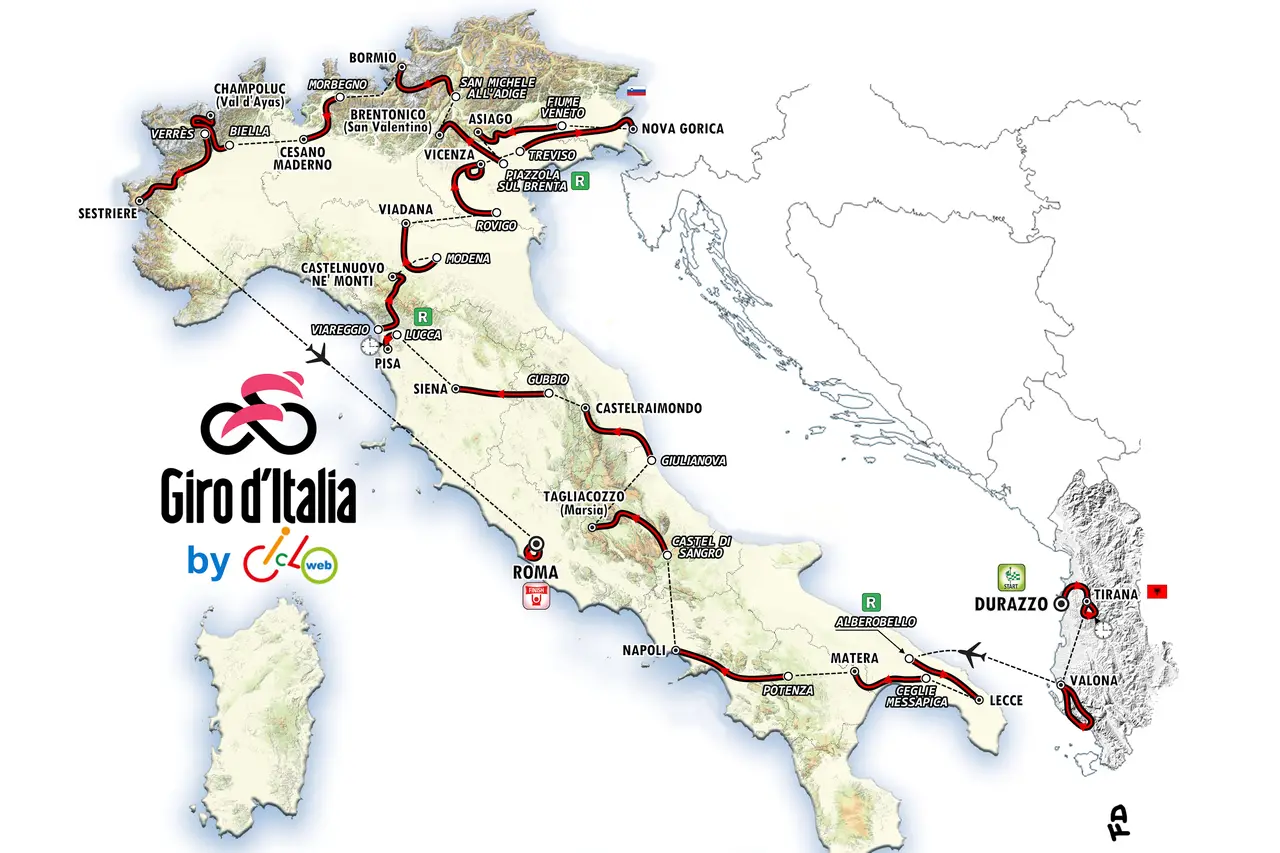 Di fatto sapete già un po' tutto quello che abbiamo scoperto e che vi abbiamo condiviso passo passo: potete ricostruire l'indagine leggendo a ritroso gli articoli contenuti nella sezione Giro d'Italia del nostro sito. Intanto è stata ufficializzata a ridosso di Natale la Grande Partenza dall'Albania, confermando comunque le anticipazioni che avevamo lanciato già da molte settimane. Non ci resta che svelarvi anche le 36 sedi delle rimanenti 18 tappe, dandovi anche quanti più dettagli possibili sul tracciato delle singole frazioni.
