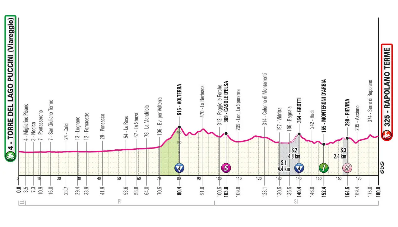 Dopo un primo blocco di tre volate, la 6a tappa del Giro d'Italia torna effettivamente ad essere una frazione esigente, trattandosi della tappa degli sterri, anche se la sua realizzazione - lo abbiamo detto in tutte le salse - è piuttosto sottotono. Ad ogni modo dopo i primi 70 km pianeggianti il tracciato troverà pochissima pianura (quasi 2000 metri di dislivello in 110 km) e sarà condito da 11.6 km di strada bianca (anche se distanti dal traguardo) e potrebbe regalare spettacolo almeno per il successo di tappa. Inaugura le danze la lunga salita a Volterra (8.6 km al 4.7%, con un primo tratto di 3 km al 5%, 2 km di falsopiano e gli ultimi 3.5 km più tosti al 6.3%, max 10%). Qui inizia un tratto di montagne russe, con un primo strappo già a Volterra ai piedi della Fortezza (700 metri al 5%), quindi quello di Monte Terzi (circa 1.5 km al 5%) e i due verso la Bertesca (in tutto 4.5 km al 3%). Con tracciato sempre mosso e tortuoso ci si diriga a Casole d'Elsa, con una prima dura rampa verso Corsina (1 km all'8%) e un ulteriore rinzillo (400 metri al 9%) che porta al traguardo volante. Con la successiva discesa si entra in una fase più lineare di fondovalle, con tratti di salita verso il Poggiaccio (1 km al 5%) e la Colonna di Montarrenti (500 metri al 5%). Al termina della successiva discesa si arriva a Rosia e in breve tempo si entra nel primo settore di strada bianca di Vidritta, 4.4 km completamente pianeggianti, spezzati da un breve tratto in asfalto poco dopo metà. La strada torna a salire subito dopo nel secondo settore che da Bagnaia (con un primo strappo di 600 metri al 5%) porta al GPM di Grotti (ignorando i dati ufficiali, circa 3 km al 5.4%, max 15%). Questa è forse la principale asperità di giornata ed è posta a 40 km dal traguardo; sono forse tanti per aspettarsi battaglia, ma va detto che da qui in avanti il percorso non concede alcun respiro e se affrontato di petto potrebbe fare più danni di quello che l'altimetria dà a vedere. Al termine della discesa si susseguono tre tremendi risciacqui con punte fino al 20% per superare Radi e raggiungere l'Intergiro di Monteroni d'Arbia. Il gruppo si deve accontentare di 3 km pianeggianti, poi la strada torna complicata: si rincorrono lo strappo del Taglione (1 km al 5%) e la salita a gradoni (in tutto 4.5 km al 2.5%, dato molto ingannevole) verso Rofeno, dove inizia lo sterrato ondulato di Pievina di 2.4 km. Mancano adesso solo 15.5 km, ma le difficoltà non sono terminate: a fine discesa inizia lo strappo di Asciano (1.1 km al 5.5%, con una punta in doppia cifra all'inizio e tratto in lastricato di 400 metri), che non sarà seguito da alcuna discesa, ma da un tratto di falsopiano che conduce fino ai piedi dell'ultima asperità delle Serre di Rapolano (1 km al 10.2%, max 20%) con scollinamento a soli 4.2 km dall'arrivo. Il percorso non incontrerà pianura nemmeno nelle ultime battute, con continui saliscendi e strade tortuose: si segnala uno zampellotto di 400 metri al 6% in vista della flamme rouge e il rettilineo finale di 450 metri esso stesso in lieve ascesa (max 6%).