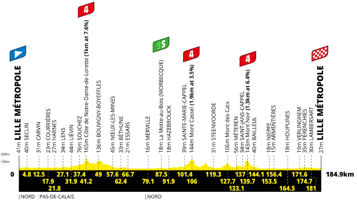 Il Tour de France 2025 prende il via con una 1a tappa per velocisti, ma con alcune insidie da non sottovalutare. Il percorso risente infatti dell'aria fiamminga e lambisce colline note al mondo del ciclismo per gare come Gent-Wevelgem e 4 jours de Dunquerke. È sicuramente troppo isolata la tosta Côte de Notre-Dame-de-Lorette per poter significare qualcosa; si dovrà invece stare molto attenti nella sequenza che prevede il Mont Cassel (1.9 km al 3.5%; con 1.3 km di pavè), il ritorno ai suoi piedi nei pressi del Mont des Récollets (2.5 km al 3%, max 7%), il Mont des Cats (1.8 km al 3.5%, max 11%) e il Mont Noir (1.3 km al 6.3%, max 10%). Quest'ultimo “muretto” termina a circa 45 km dal traguardo, una distanza ampia che lascia spazio per recuperare terreno a corridori attardati ed organizzare una volata a ranghi compatti; si tratta comunque di un tratto di 40 km, tortuoso e complicato che richiama appunto atmosfere fiamminghe e potrebbe anche risvegliare l'animo dei corridori più combattivi. Dopotutto c'è in ballo la prima maglia gialla e cercare di mettere in difficoltà i velocisti meno resistenti potrebbe consentire di eliminare qualche pretendente dalla sfida. Il ritorno verso Lille è piuttosto lineare, sono un po' più tortuosi gli ultimi 10 km in area urbana e nei precedenti 20 è concreta la possibilità che possano realizzarsi alcuni ventagli; ad ogni modo l'ultima curva a sinistra si trova ad 1.4 km dall'arrivo, che saranno perfettamente rettilinei.