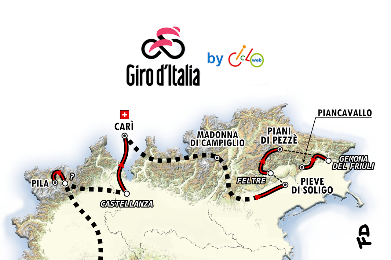 Confermato il finale con doppia ascesa Piancavallo, all'indomani del tappone dolomitico; a inizio dell'ultima settimana spunta anche Madonna di Campiglio