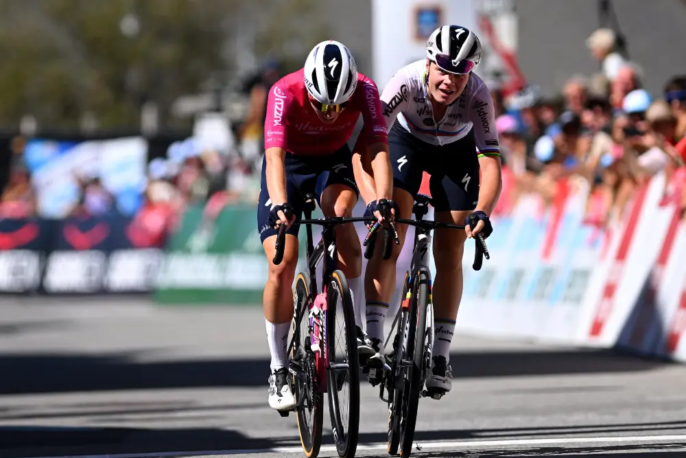 Per la vittoria è quindi una questione a due tra compagne di squadra, sia per la tappa che per la classifica generale, dove Kopecky sarebbe leader se non dovesse essere staccata, in virtù dei sei secondi di abbuono guadagnati ieri. Le due non si risparmiano di certo in volata, come già successo altre volte in passato: Vollering lancia lo sprint dalla testa ai -200 metri e riesce subito a prendere qualche metro di vantaggio, ma dopo essersi inizialmente seduta, la belga si rialza sui pedali e la affianca negli ultimissimi metri. Si decide tutto sul tempismo al colpo di reni, che Kopecky anticipa troppo, mentre Vollering fa tutto perfettamente e si aggiudica la vittoria per una questione di centimetri, in un photofinish molto incerto.