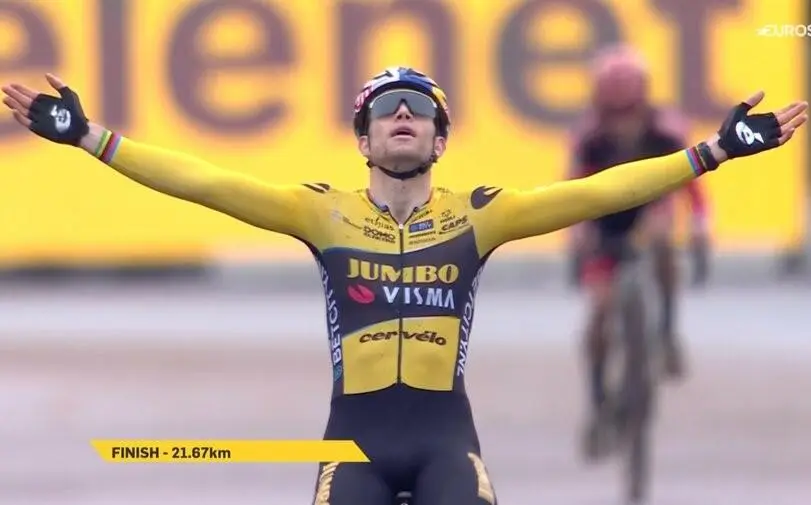 Wout si prende la seconda vittoria della stagione in assenza del campione del mondo. Il fuoriclasse della Jumbo deve però sudarsela sul circuito automobilistico contro un Eli stoico. Terzo Nieuwenhuis
