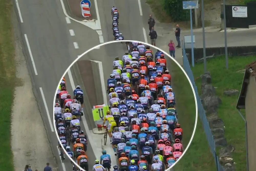 Con uno scarto di incredibile reattività lo sloveno si è buttato - scodando - sulla destra. Ma alle spalle di Tadej non altrettanta sveltezza o fortuna ha avuto Fred Wright della Bahrain-Victorious, che il segnale l'ha invece toccato (pur provando anch'egli a passare indenne), intraversandosi subito dopo e andando giù insieme a quelli che gli erano intorno, ovvero il suo stesso capitano Pello Bilbao, Gregor Mühlberger e Nelson Oliveira della Movistar, e Sébastien Grignard della Lotto Dstny, mentre il compagno di quest'ultimo Arnaud De Lie si è salvato per poco dalla caduta mettendo il piede a terra.