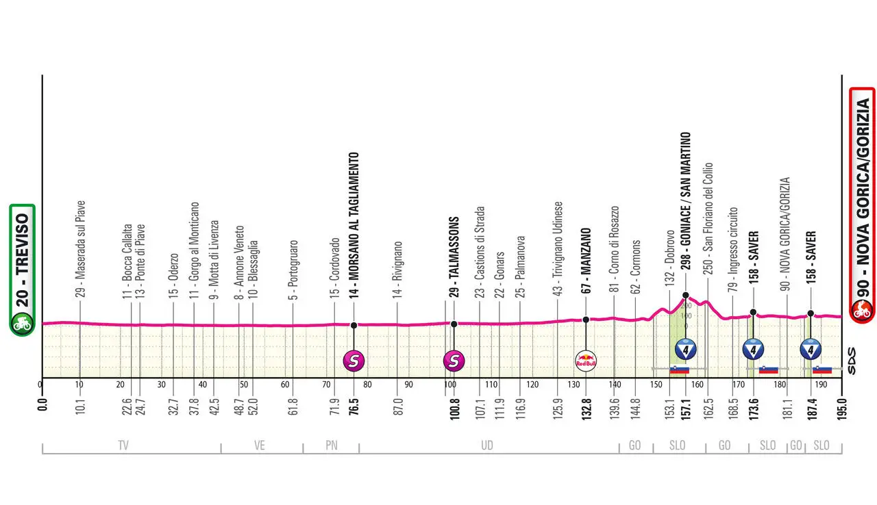 L'arrivo è perfettamente pianeggiante, dunque adattissimo ai velocisti puri. Tuttavia i circa 1000 metri di dislivello sono racchiusi negli ultimi 50 km e c'è il terreno per mettere qualcuno in difficoltà. Due nomi ce li suggerisce il traguardo di Vicenza: Mads Pedersen (Lidl - Trek) e Wout van Aert (Team Visma | Lease a Bike). Il belga, ha una voglia matta di vincere un'altra tappa, tuttavia ha in squadra il vincitore dell'ultimo sprint a ranghi compatti, Olav Kooij, quindi probabilmente starà a guardare cosa fanno gli altri. La Lidl-Trek ha invece più che mai voglia di far corsa dura, sia per far vincere ancora Pedersen, sia per dare una nuova chance a Mathias Vacek, per il quale lo strappo di Saver sembra tagliato a misura per uno scatto da finisseur.