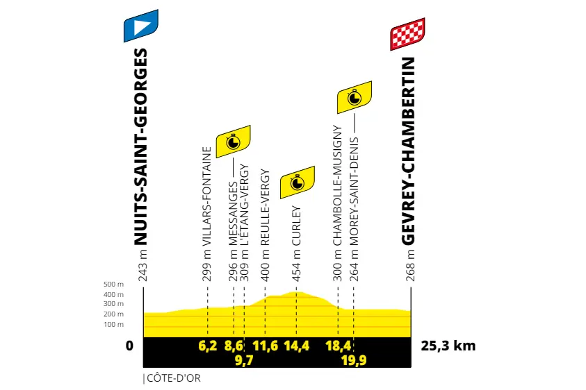 Dopo tante salite e due giornate di respiro, al Tour de France 2024 arriva un nuovo scossone alla classifica, assai rilevante nel creare delle gerarchie più definite su cui fondare le tattiche nelle giornate che seguono e capire chi effettivamente è in lizza per il successo e chi invece dovrà cercare di rincorrere. La 7a tappa è la prima di due cronometro individuali, fondamentali per chi vuole vincere la Grande Boucle: non è lunghissima ed è anche piuttosto tortuosa ed ondulata. Lo strappo verso Reulle-Vergy (circa 1.5 km al 6.5%) è l'unica vera asperità, ma di strade rettilinee ed effettivamente pianeggianti non se ne trovano mai. Questo significa che gli uomini di classifica potrebbero essere agevolati nel contendere la tappa ai cronoman.