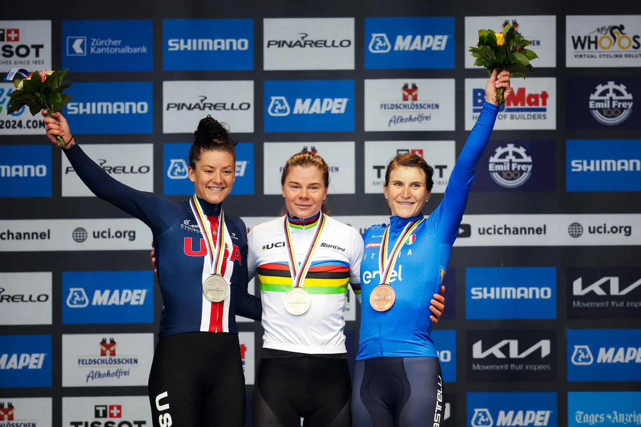Lotte Kopecky (Belgio) si riconferma Campionessa del Mondo in una giornata segnata dalla pioggia e dal ricordo di Muriel Furrer. La belga batte in volata Chloé Dygert (Stati Uniti) e la nostra Elisa Longo Borghini, splendida medaglia di bronzo.