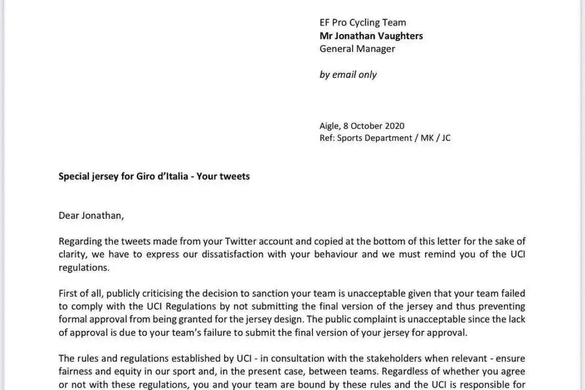 L’uscita di Vaughters in Romandia non ha avuto (almeno per ora) conseguenze formali. Ma non è la prima volta che il manager statunitense entra in rotta di collisione con l’UCI. Nel 2020 aveva già ricevuto un richiamo ufficiale, firmato da Matthew Knight, Head of Road dell’UCI, in merito a dei tweet scritti contro Lappartient in seguito alle multe per delle maglie speciali al Giro d’Italia maschile indossate dalla EF. Vaughters ha reso pubblica cinque anni dopo la lettera su Instagram con il commento secco "After thinking on it. I think it’s best to just let this note speak for itself (Dopo averci pensato, credo sia meglio lasciare che questa nota parli da sola)". La lettera è riportata in fondo all'articolo con la traduzione