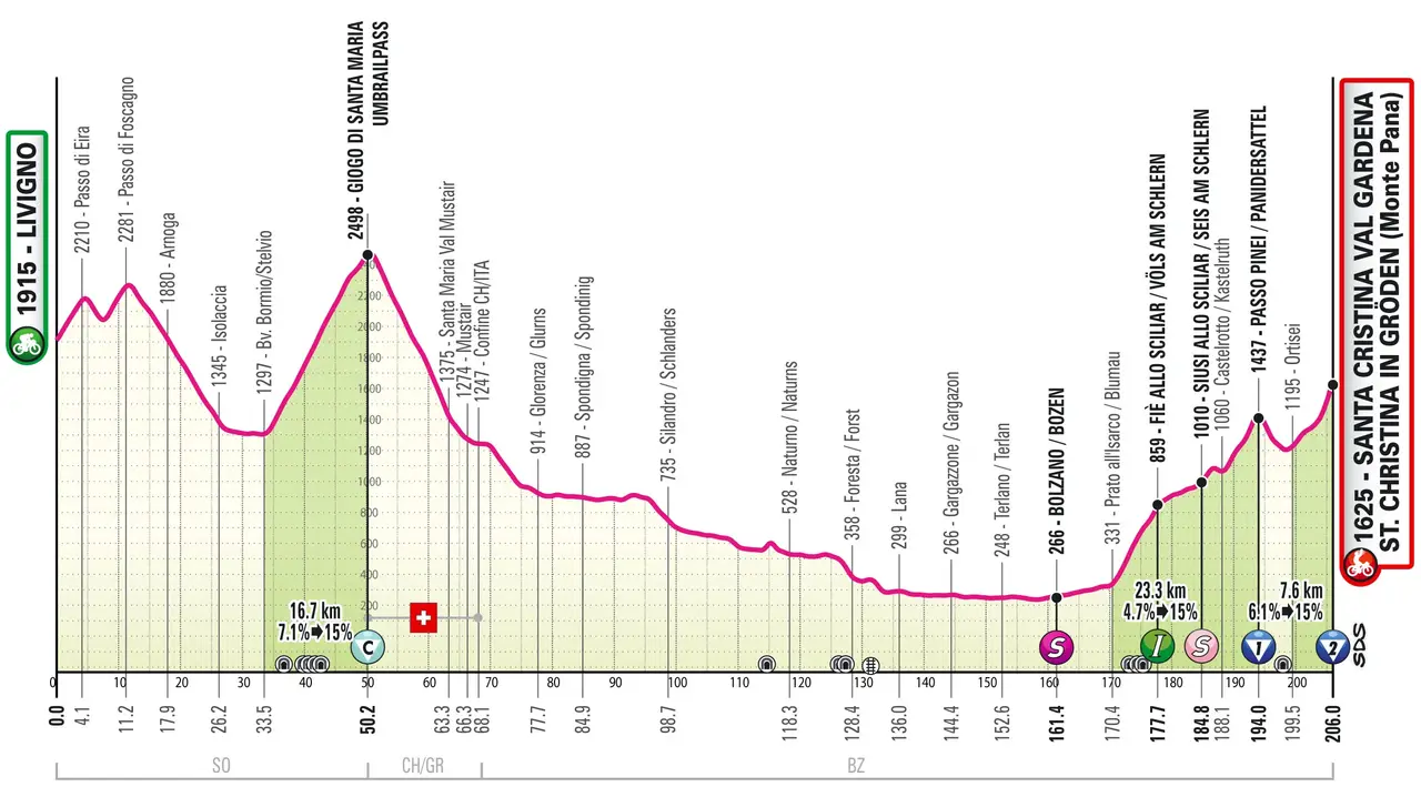 Dalla Val Monastero si torna velocemente in Val Venosta, rientrando in Italia dopo soli 16 km, continuando ancora a scendere fino alle porte del borgo fortificato di Glorenza. Con pochi km di fondovalle si raggiunge Spondigna dove si rientra sul percorso originale. Da qui ancora 85 km di fondovalle servono per raggiungere Prato all'Isarco, i quali potrebbero passare più velocemente del previsto, considerando che fino a Bolzano la strada è sempre a favore, con almeno tre tratti di discesa vera e propria (tant'è che da circa 900 metri di altitudine si scende fino a poco più di 200). La salita al Passo di Pinei (in tutto 23.3 km al 4.7%) è decisamente variegata: prima si affronta un primo troncone tosto di circa 7.5 km al 7.3% (max 11%) per raggiungere Fiè allo Sciliar; quindi quasi 7 km di falsopiano (1.5% di media) e un tratto di 2.8 km al 5% (max 10%) attraverso Siusi allo Sciliar; infine dopo un paio di km di discesa su Castelrotto inizia l'ultimo tratto di 5.4 km al 7%, con una prima impennata di 2.1 km all'8% (max 15%), 1 km di respiro al 3.3% e gli ultimi 2.3 km all'8%. La discesa di 5 km porta ad Ortisei dove la strada torna subito a salire per gli ultimi 6.5 km al 6.1% verso Monte Pana: in realtà i primi 4.3 km (media 4.2%, max 12%) sono il fondovalle che porta a Santa Cristina Val Gardena; dopo 200 metri di discesa inizia la vera impennata conclusiva di 2 km all'11.8%, con punte fino al 16%. Alla fine, nonostante la lunga fase morta centrale e il taglio dello Stelvio, si sommano comunque quasi 3500 metri di dislivello complessivo.