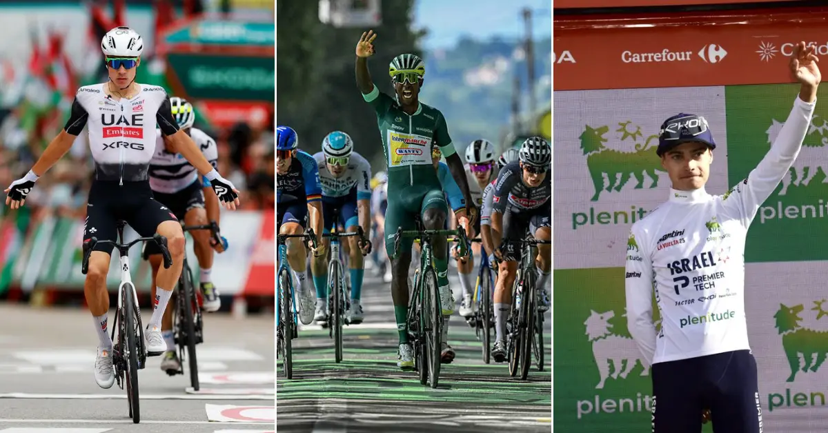 Juan Ayuso, Biniam Girmay e Matthew Riccitello © ASO-La Vuelta/Le Tour de France/Sito Internet Free Palestine