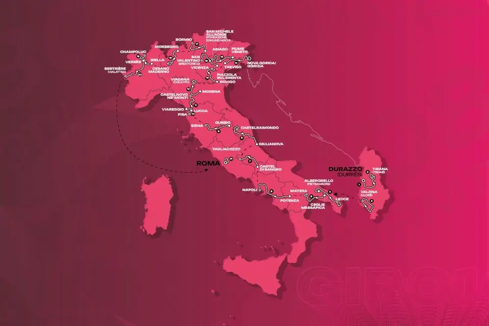 Partenza dall'Albania, due cronometro, Champoluc e Colle delle Finestre/Sestrière le tappe decisive, finale a Roma