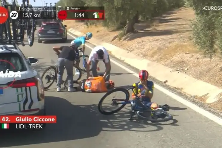 A circa 16 chilometri dalla fine però, mentre il gruppo dei migliori inseguiva la fuga di giornata apprestandosi ad affrontare la salita finale di Sierra de Cazorla, le telecamere hanno inquadrato due corridori a terra: si trattava di Giulio Ciccone (Lidl-Trek) e Txomin Juaristi (Euskaltel-Euskadi) entrambi caduti dalla bicicletta e apparentemente senza nulla di grave, ma intenti a guardarsi le ammaccature riportate nell'incidente, del quale non era stata mostrata la dinamica.