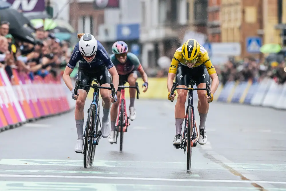 Si arriva dunque a una volata a tre, con due terzi del podio di un anno fa e una debuttante assoluta, sicuramente rispettata dalle altre due per la volata ma teoricamente senza ambizioni di classifica. Quando Niewiadoma prova ad anticipare agli 800 metri tocca a Vollering andare a chiudere il buco, con Pieterse che può attendere sulle ruote fino ai -300, prima di lanciare una volata lunghissima. Vollering esita un paio di attimi prima di entrare in scia, si affianca e negli ultimi metri è un testa a testa molto ravvicinato. È un photofinish al colpo di reni, con nessuna delle due che si sente di esultare dopo il traguardo, ma qualche minuto dopo viene confermata la vittoria di Puck Pieterse.