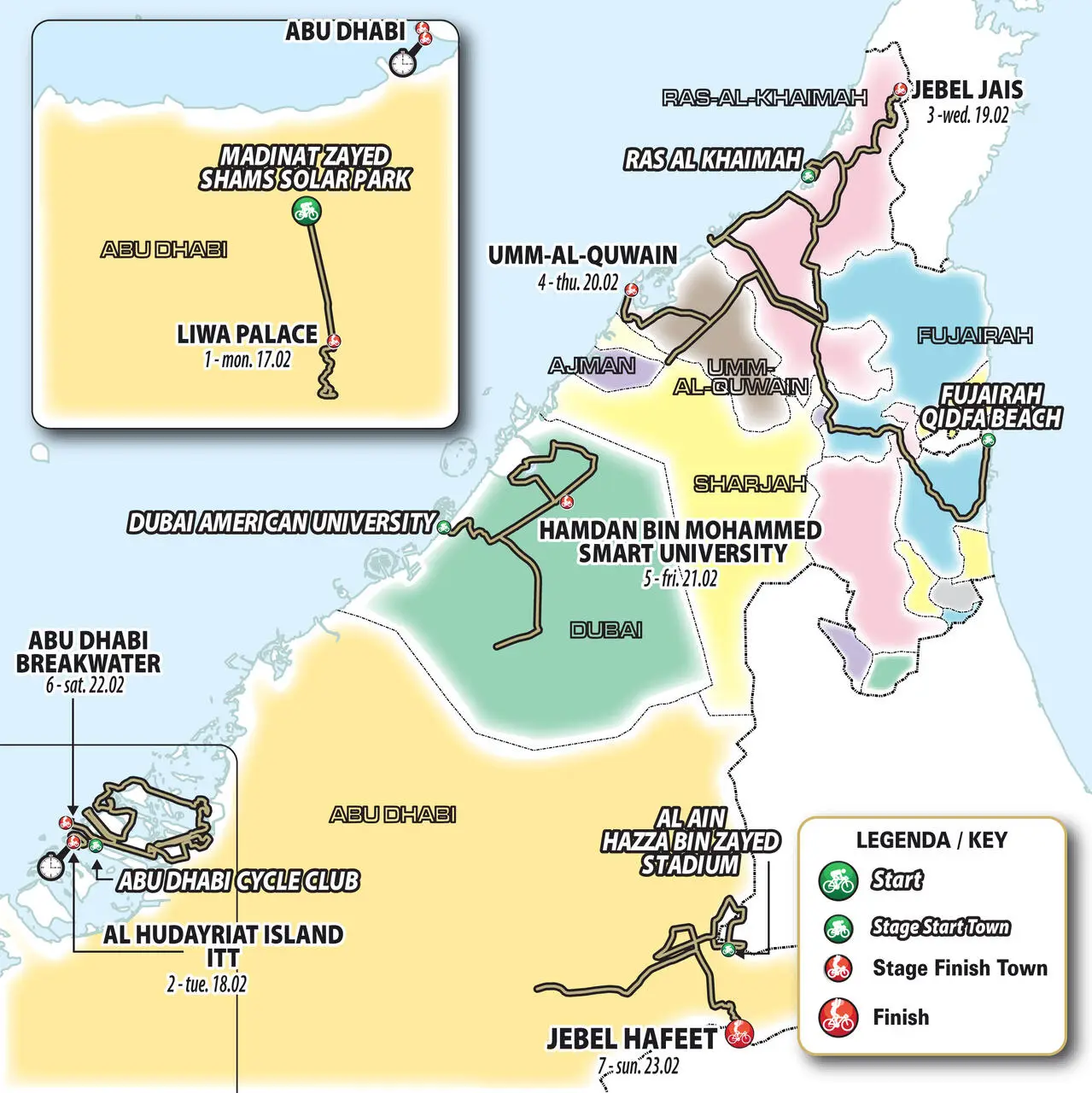 Ufficiali i tracciati sia della corsa femminile che di quella maschile; tutto quasi identico al 2024, con la tappa mossa sulle dune, Jebel Jais e Jebel Hafeet