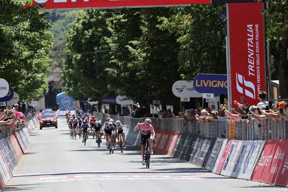Anche senza abbuoni in palio, il Giro non è ancora finito. Dietro in tante provano a partire dai primi metri dello strappo ma rimbalzano indietro, mentre Bradbury ci prova a 500 metri dall'arrivo. La mossa della maglia bianca innesca la reazione di Kopecky, che ha un'ultima cartuccia da sparare per tentare il tutto per tutto. La scena è però sempre la stessa di questi sette giorni, ieri anche a parti invertite: una delle due parte, l'altra si incolla alla ruota. E questa volta Longo Borghini non solo risponde, ma ai 200 metri vede lo spiraglio per partire e mettere la parola fine su questo Giro.