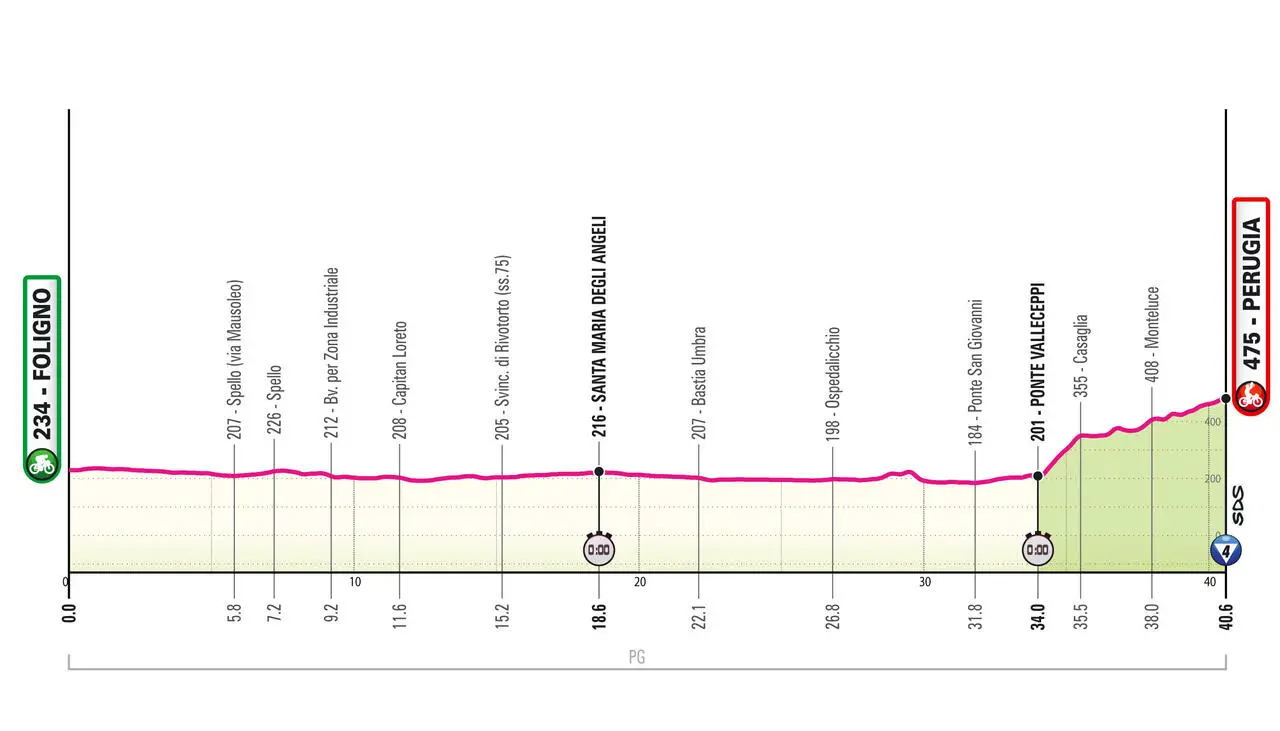 Giornata cruciale nell'evoluzione della classifica generale di questo Giro d'Italia, che propone 40.6 km di cronometro individuale, destinati a fare grandi distacchi. A creare divari sarebbero già stati sufficienti i primi 34 km completamente pianeggianti e piuttosto lineari, dove gli specialisti possono far valere le proprie qualità. Lo scenario cambia radicalmente per gli ultimi 6.6 km (4.2% di media), tanto che l'organizzazione ha previsto una postazione per il cambio bici: la strada impenna improvvisamente fino a Casaglia per 1.3 km all'11.8% (max 16%), poi prosegue ondulata fin sul traguardo nel centro storico con ulteriori rampe di salita vera (max 11%) alternate a tratti in lieve discesa. Una prova difficilissima da interpretare, in cui gli ultimi km di salita potrebbero ribaltare la situazione registrata al secondo intermedio. Difficile comunque che gli scalatori più puri possano stravolgere la propria prestazione, visto che sulle dure pendenze che li avvantaggiano sentiranno comunque il peso della fatica durata nei precedenti 34 km a loro indigesti.