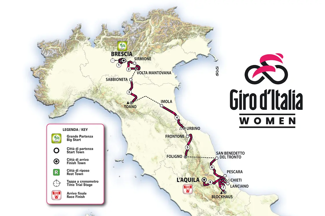 È arrivato il momento della prima edizione targata RCS del Giro d'Italia femminile, con la nuova denominazione di Giro d'Italia Women. L'edizione 2024 presenta un percorso intrigante, variegato, che coinvolgerà ampiamente l'Appennino tra Emilia, Romagna, Marche ed Abruzzo, chiudendosi proprio nel cuore delle montagne, a L'Aquila. Si parte da Brescia con una cronometro non banale che creerà una prima classifica generale, destinata però ad essere decisa sulle tante salite che compongono ben 5 delle 7 tappe in linea. Prima sfida a Toano sull'Appennino reggiano, quindi una frazione romagnola/marchigiana con traguardo ad Urbino, una tappa senza respiro con arrivo a Chieti e poi le due frazioni in alta quota con protagonisti Blockhaus e Gran Sasso. Un percorso pensato per dare spettacolo quasi tutti i giorni e scompaginare la classifica più volte con tappe dure che favoriscono di volta in volta atlete con caratteristiche diverse.