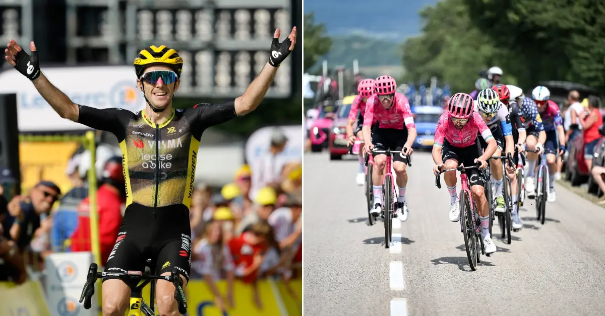 Torniamo davanti: Healy si incarica di guidare il sestetto al comando verso la penultima salita di giornata, con il chiaro obiettivo di conquistare il primato. Il passo imposto sulla Croix Saint-Robert dal vincitore della tappa di Vire Normandie mette in difficoltà Simmons, che perde le ruote dei primi a 14 km dall'arrivo. Non solo: la sua andatura è tale che il vantaggio sul gruppo maglia gialla sale a 6'10" in vista degli ultimi 11 chilometri della tappa. Ancora uno stacco sui migliori: a metà della Croix Saint-Robert, si rivedono i Visma in testa al gruppo. A farne le spese è il danese Mattias Skjelmose Jensen (Lidl-Trek). Abbastanza affaticato anche il francese Kévin Vauquelin (Arkéa), costantemente in coda al gruppo. Poco prima della vetta, rilancia ancora Jorgenson, immediatamente seguito da Pogacar e Vingegaard. Rispondono subito all'appello Evenepoel, lo sloveno Primoz Roglic (Red Bull-BORA-Hansgrohe), il tedesco Florian Lipowitz (Red Bull), Evenepoel, Onley, il norvegese Tobias Johannessen (Uno-X). Più indietro Vauquelin.
