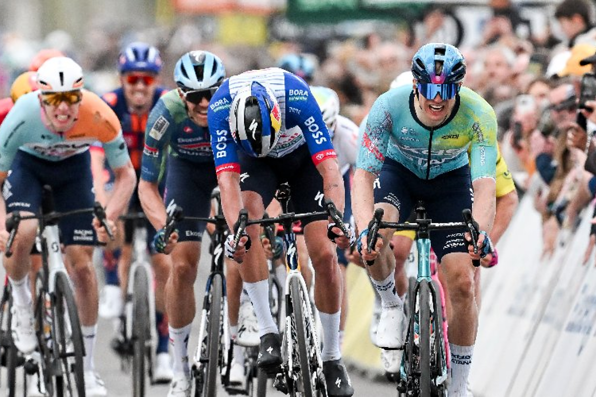 Altra volata caotica e prima vittoria nel World Tour per il tedesco della XDS Astana, che batte Pithie e Stuyven. Lamperti resta in giallo, Ayuso guadagna 4"