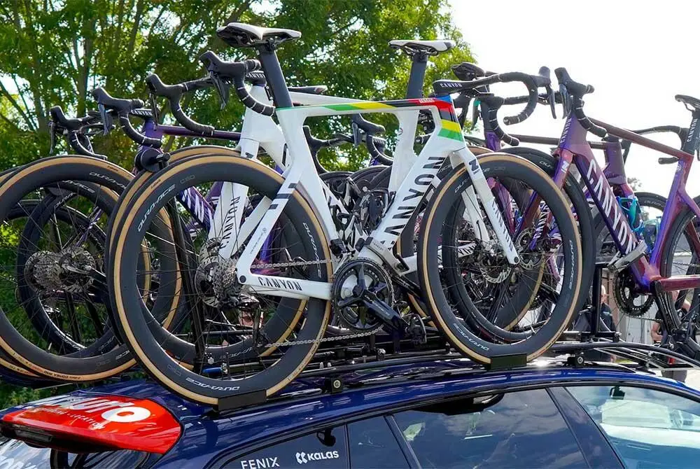 Le biciclette della Movistar, come quelle della squadra femminile, sono montate SRAM: gruppo Red eTap AXS e ruote Zipp; la Alpecin-Deceuninck monta Shimano: gruppo Dura-Ace R9200 e ruote Shimano Dura-Ace