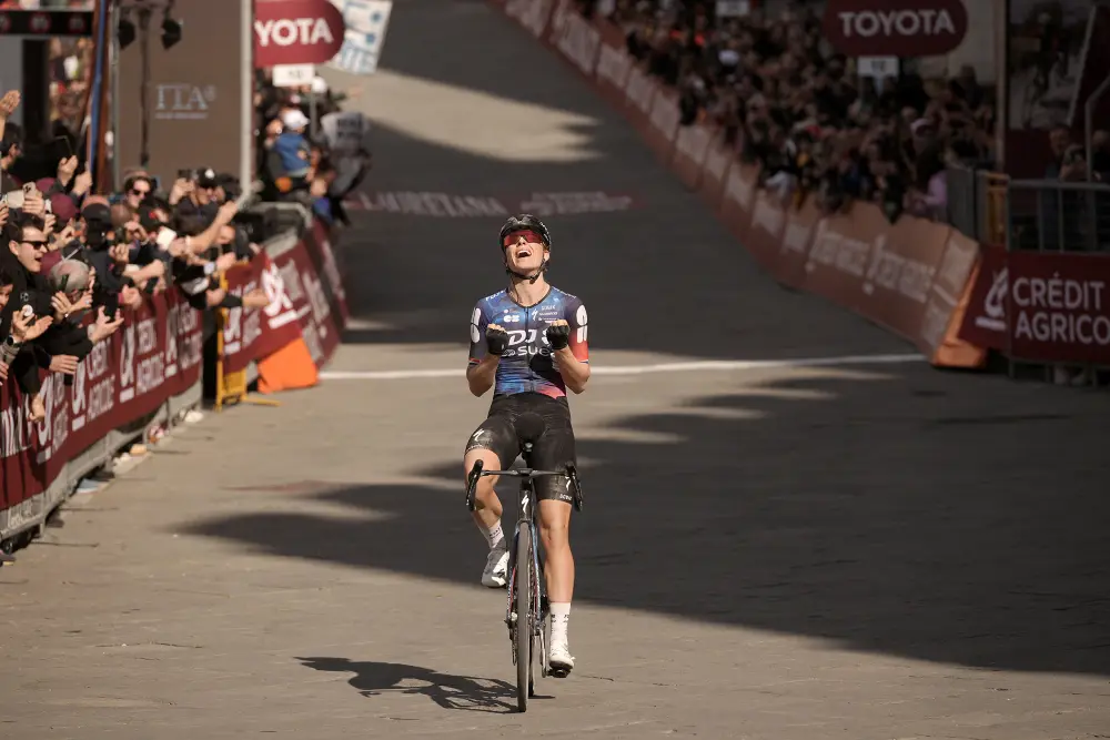 Le due se ne vanno su Le Tolfe, poi Demi fa il vuoto in Via Santa Caterina e vince la prima classica con la FDJ-SUEZ. Ferrand-Prévot completa un podio stellare