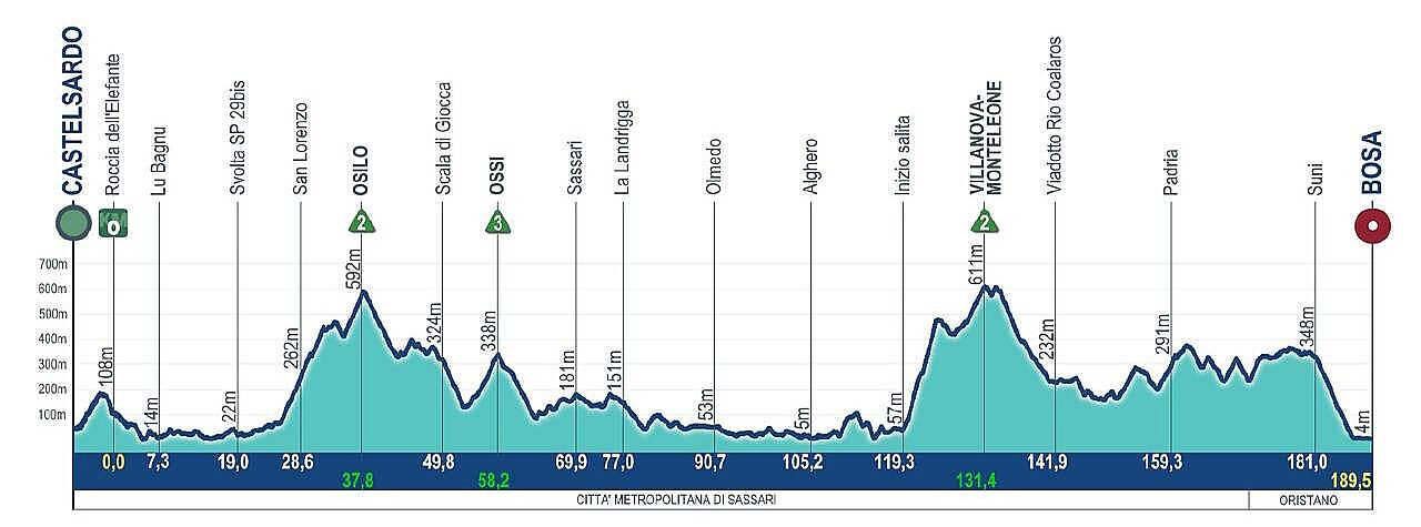 La prima tappa è già una delle più impegnative, anche se aperta a molte soluzioni. Dopo 25 km semplici inizia la lunga salita di Osilo (12.3 km al 4.2%, divisi in due tronconi di circa 6.5 km al 6% e 2.7 km al 6.5%), seguita presto da quella di Ossi (4.4 km al 4.5%). Il successivo tratto di quasi 60 km è moderatamente ondulato ma comunque semplice. Lo scenario cambia del tutto per salire a Villanova-Monteleone (12.1 km al 4.6%): un primo troncone di salita di 4.8 km al 9% (max 12%) può spaccare la corsa, seguito da una breve discesa e un secondo tratto di quasi 5 km al 4%. I 58 km che mancano per andare al traguardo sono molti, ma il continuo susseguirsi di brevi asperità non agevola il rientro dei ritardatari, né tantomeno l'inseguimento dei fuggitivi. Si contano almeno 5 denti di lunghezza variabile (da 1 a 5 km) con pendenze abbastanza lievi, l'ultimo dei quali termina a meno di 20 km dall'arrivo. La strada resta in altopiano per 8 km, quindi inizia la discesa di 5.5 km, che termina a soli 3 km dal traguardo.