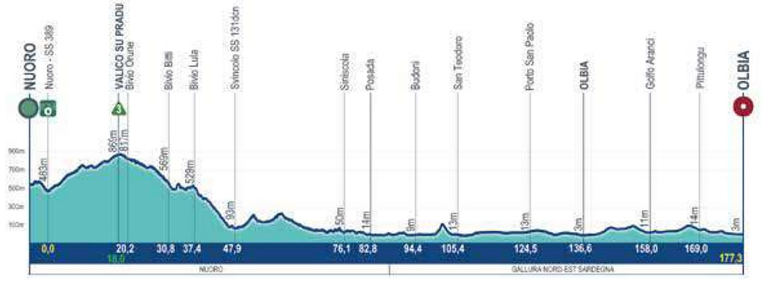 Tappa per velocisti priva di vere salite. Per uscire dalle montagne si supera di nuovo il Valico di Su Pradu ripercorrendo in salita la “non discesa” del giorno precedente (18.1 km al 2.1%) Dopo 30 km di discesa il percorso si fa semplice, mosso solo da qualche salitella non temibile. Il circuito finale intorno a Olbia è comunque più mosso di quanto non sembri dal profilo ufficiale, ma comunque è difficile credere che qualcuno possa animare la corsa. Si segnala un ultimo zampellotto a circa 5 km dall'arrivo.