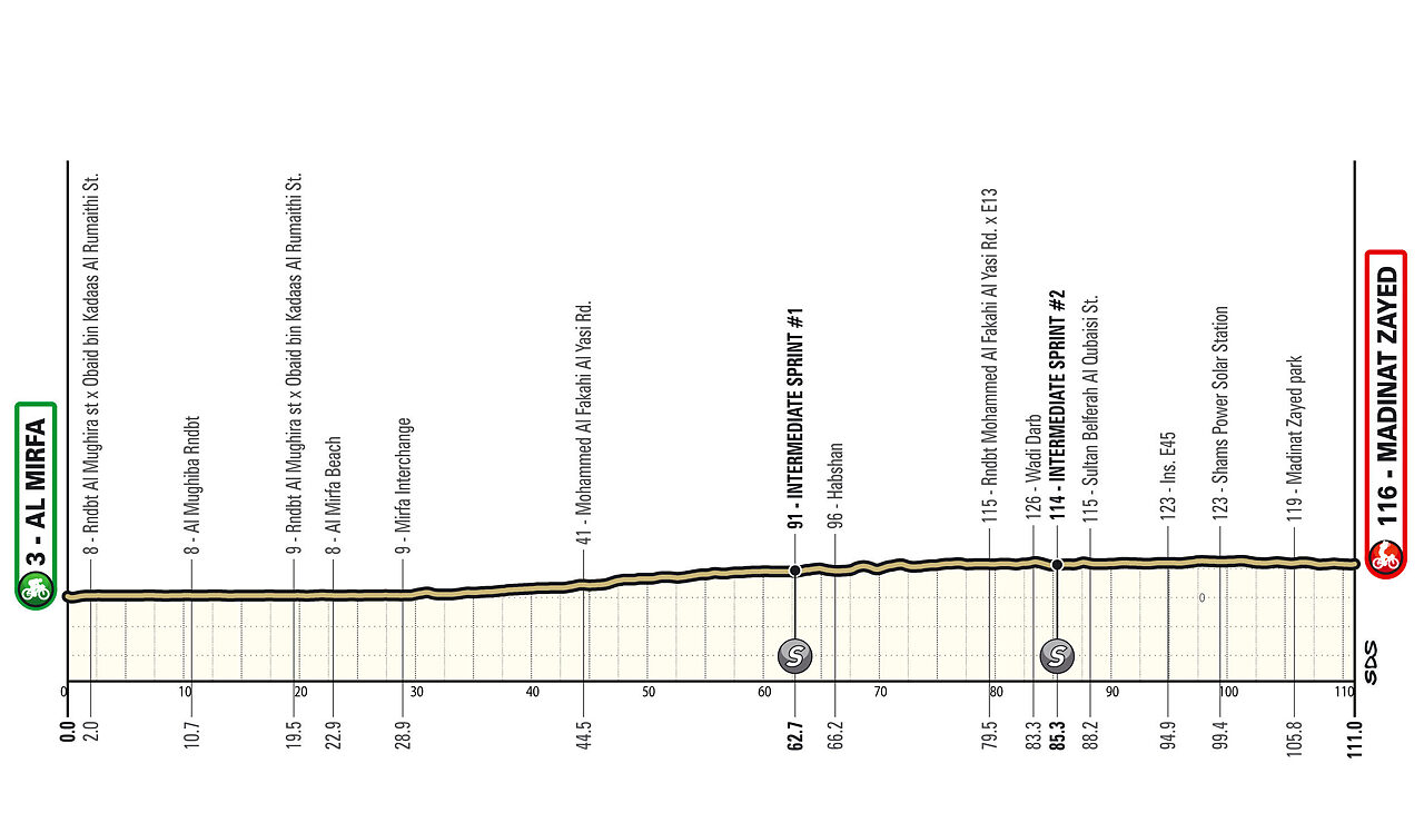 Terzo giorno consecutivo da volata, stavolta in quel di Abu Dhabi, con un'altra frazione che non dovrebbe riservare sorprese. Qualche tratto su terrapieni in mezzo al mare potrebbe essere esposto al vento, ma le ragazze saranno ancora lontane dal traguardo. Anche in questo caso il finale è assolutamente lineare: l'ultima curva (per altro poco significativa) è a quasi 2 km dall'arrivo e soltanto un paio di semicurve impediscono di vedere il traguardo prima degli ultimi 250 metri.