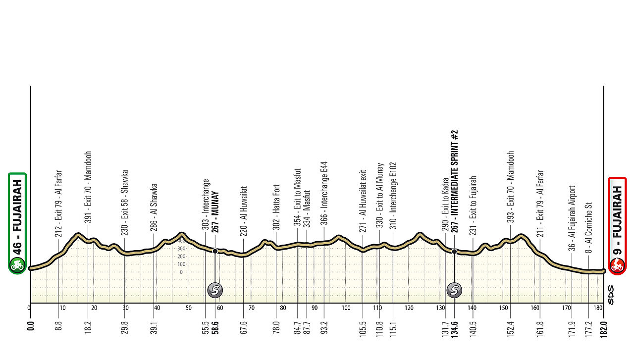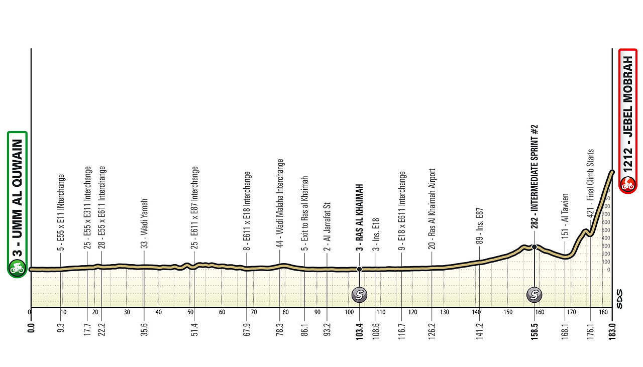 Anche quest'anno la terza frazione è destinata al primo arrivo in salita, chiudendo tre giorni di corsa molto intensi. Tuttavia l'arrivo ormai classico a Jebel Jais è stato sostituito dall'inedita salita a Jebel Mobrah, una specie di Angliru emiratino che potrebbe chiudere i giochi per la corsa. Dopo 150 pianeggianti si incontrano prime leggerissime ondulazioni, ma è intorno al km 170 che inizia la salita finale; ufficialmente è di 14.9 km, ma quasi 2 sono pressoché pianeggianti, perciò possiamo misurarla in 13.3 km al 7.8%: inaugura l'ascesa un primo segmento irregolare di circa 5 km al 6.7%, ma con molti tratti duri (max 13%); 1700 metri di discesa, separano nettamente questo antipasto (già impegnativo) dalla tremenda impennata finale di 6.8 km al 12%, dove la pendenza non scende mai sotto il 10% e tocca punte fino al 17%.