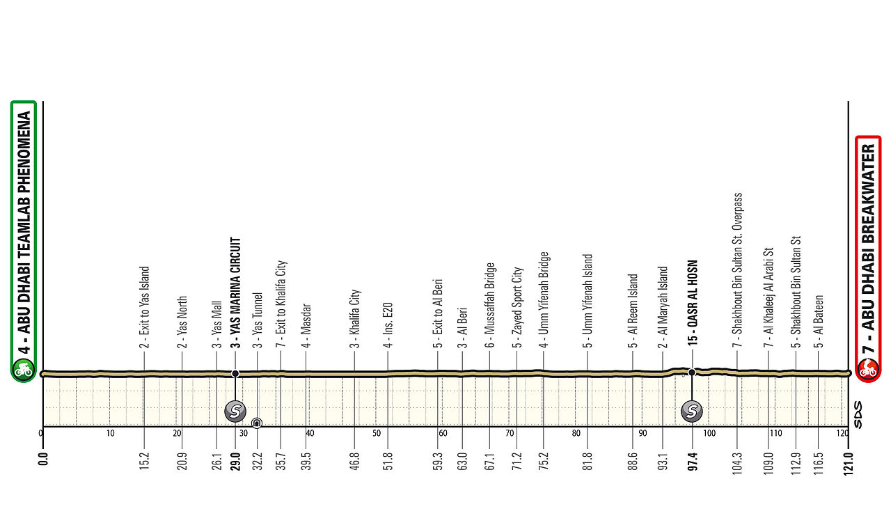 L'ultima tappa è un'ottima occasione per i velocisti che si svolge quasi interamente nel tessuto urbano di Abu Dhabi, dunque più esente dal vento rispetto alle precedenti. Per queste ragioni risulta in assoluto la più semplice delle 7. Soltanto qualche tratto su terrapieni in mezzo al mare potrebbe essere più esposto, ma l'ultimo termina a circa 35 km dall'arrivo. Anche in questo caso il finale è assolutamente lineare: l'ultima curva (per altro poco significativa) è a quasi 2 km dall'arrivo e soltanto un paio di semicurve impediscono di vedere il traguardo prima degli ultimi 250 metri.