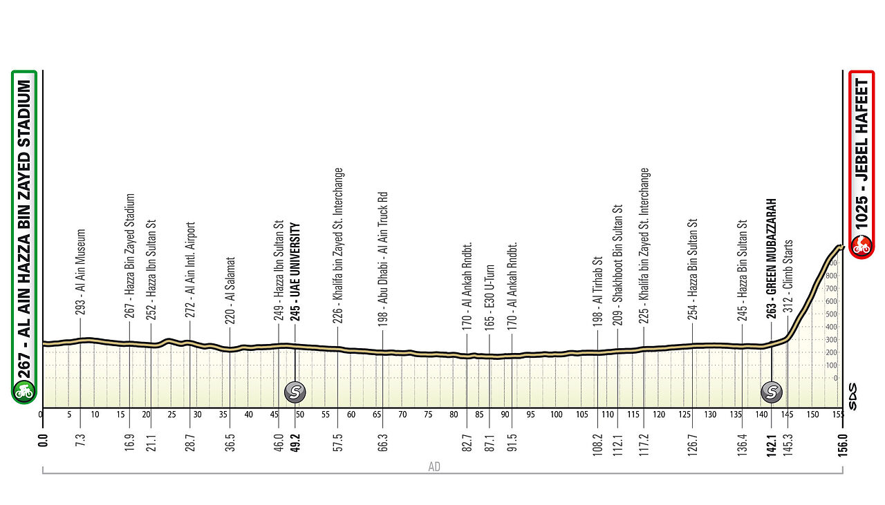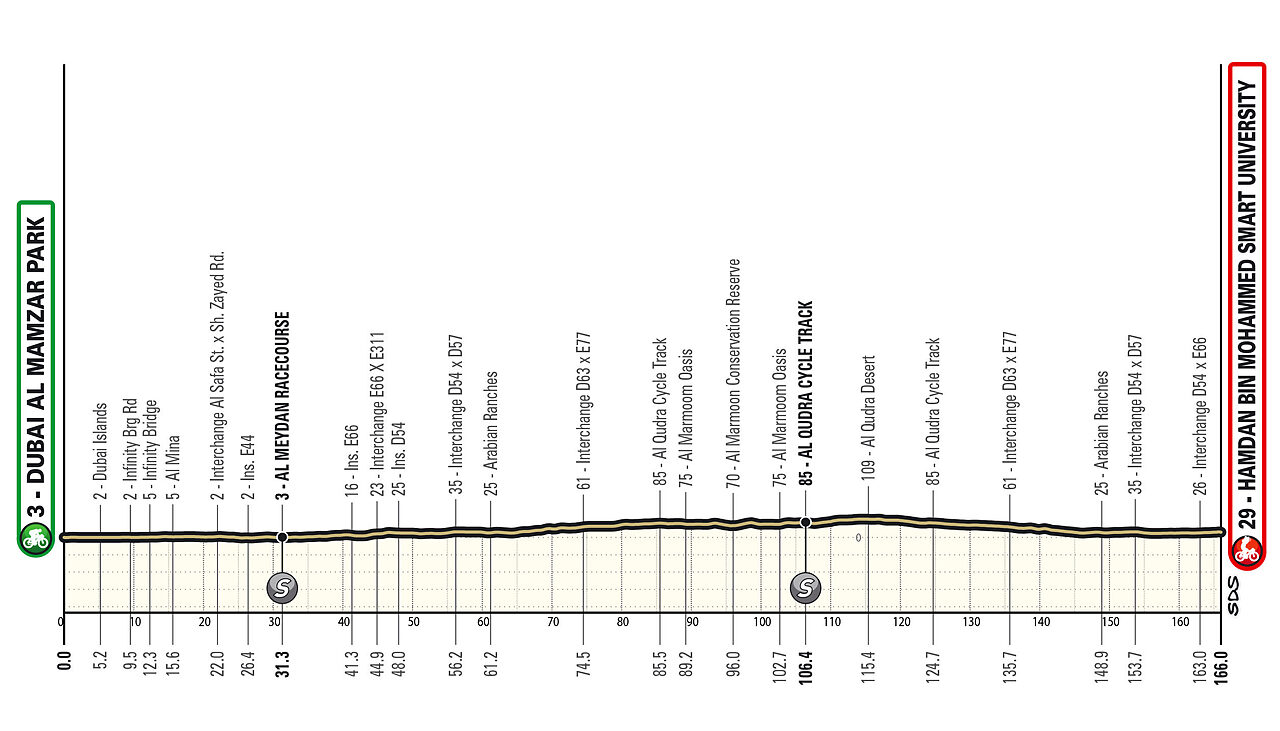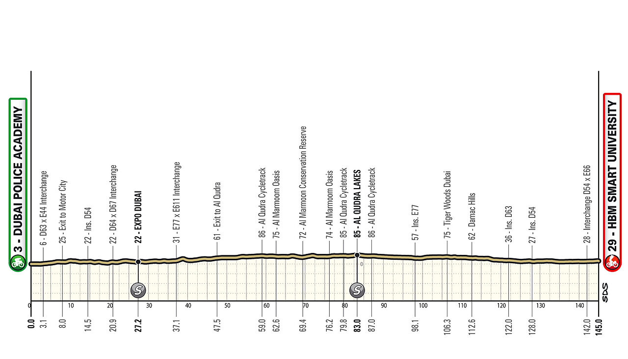 Tappa per velocisti che si svolge in buona parte a ridosso dell'area metropolitana di Dubai, la prima completamente pianeggiante. Attenzione al tratto dal km 75 al km 135, che si inoltra verso il deserto e sarà senza dubbio più soggetto ad eventuali raffiche di vento. L'ultima parte si svolge di nuovo in un'area più propriamente metropolitana. Nel finale dopo un lungo viale, si prende sulla destra uno svincolo percorrendo una lunghissima curva che termina prima della flamme rouge; l'ultima curva è a destra intorno a 600 metri dall'arrivo, mentre un'altra semicurva riduce il rettilineo finale a circa 450 metri di lunghezza.