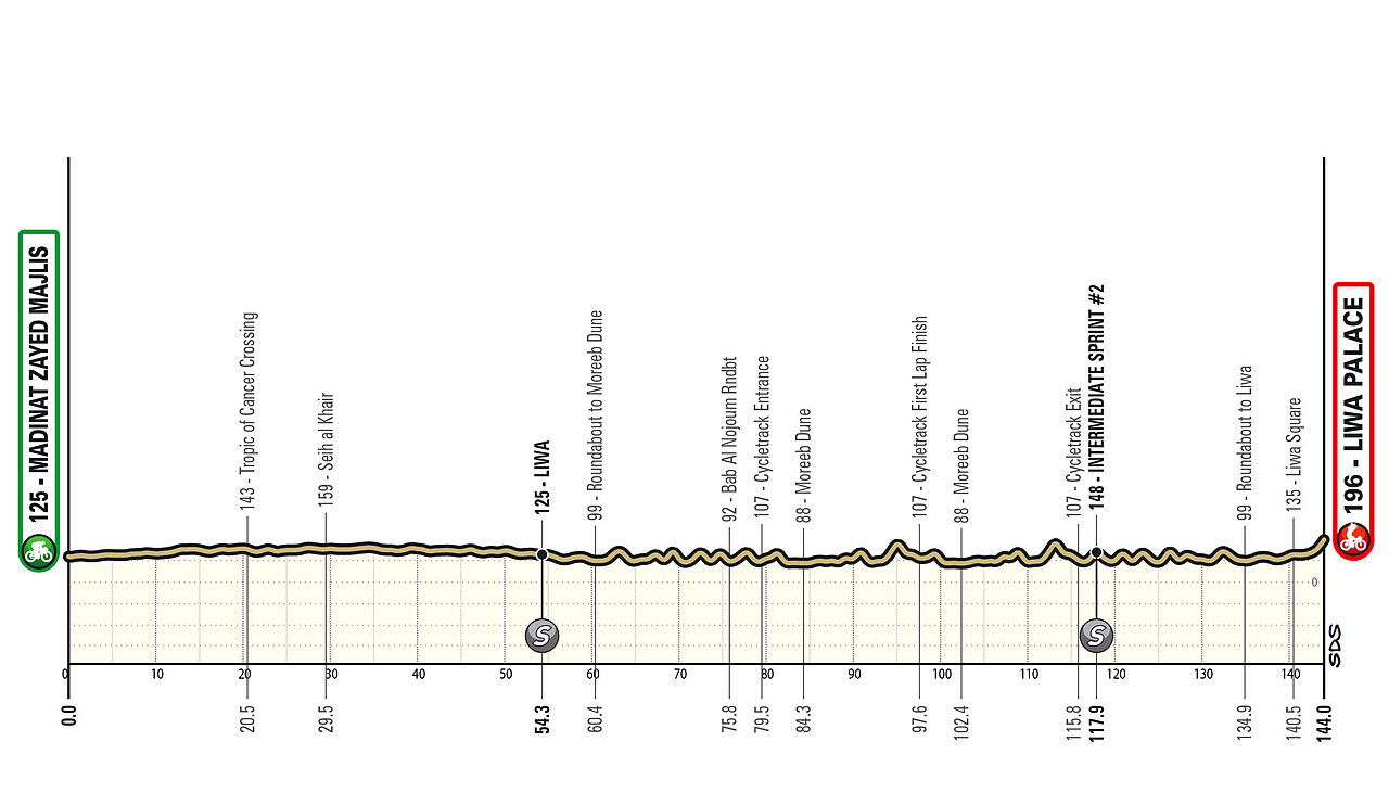 La corsa si apre anche quest'anno con la tappa nel deserto ondulata dalle dune. Tutto si svolge negli ultimi 2/3 di gara, raggiungendo e tornando da un circuito ciclabile. Proprio nel circuito si trova lo strappo più tosto (1.5 km al 7%), posto a circa 49 e 31 km dal traguardo, ma tutto il percorso è costellato di dentelli spesso anche piuttosto ripidi. L'arrivo stesso al termine di una salitella di 1.5 km al 4.2% (ultimi 700 metri al 6%, max 8%). Inoltre occhio come sempre anche al vento che renderà tutto più complicato.