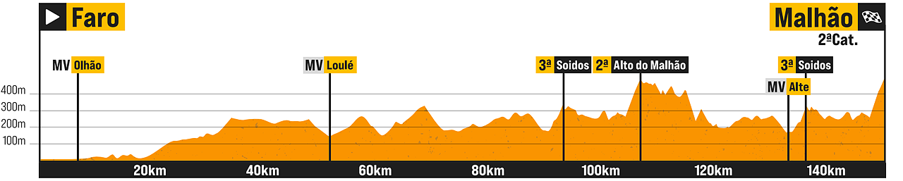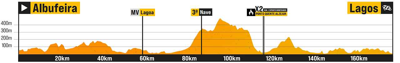 La prima tappa è destinata a chiudersi con quasi assoluta certezza in volata. In verità il tracciato è spesso mosso nei primi 120 km in linea verso Tavira, che includono il GPM di Mercador (circa 6 km al 4.5%), ma poi si fa più semplice negli ultimi 60, con l'ascesa molto semplice di Faz Fato (4.7 km al 3.2%) che non dovrebbe spaventare nessuno. Le strade restano leggermente complicate (anche se pianeggianti) fino al traguardo volante, dopo il quale invece si fanno ben più lineari: i 25 km che mancano per arrivare al traguardo sono in compenso tutti sul mare e potrebbero essere battuti da vento laterale, quindi occhio ai ventagli.