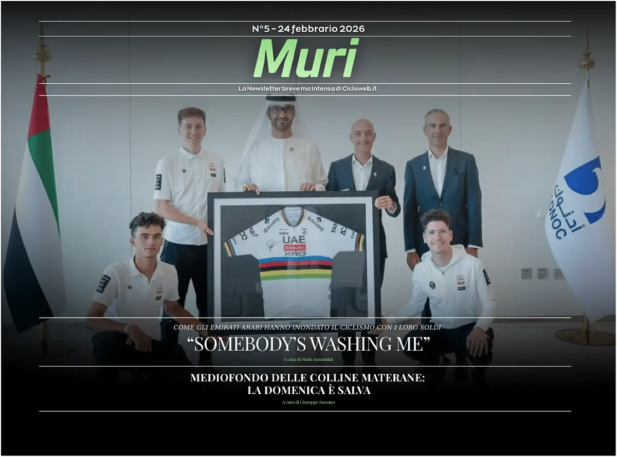 Alla sua quinta uscita, Muri propone un dittico che mette a confronto due facce del ciclismo contemporaneo. Da un lato, una disamina sul sistema di potere che si nasconde dietro la UAE Emirates-XRG: petrolio, fondi sovrani, sportwashing e un dossier di violazioni dei diritti umani che le telecamere dell'UAE Tour non inquadrano mai. Dall'altro, il racconto in prima persona di una mediofondo lucana: ventagli, fango, un compagno da andare a riprendere e una volata da sesto su sei che vale comunque una domenica salvata. Per iscriverti alla newsletter, basta cliccare su questo link e fornire la tua mail per ricevere il quinto numero di Muri domani mattina.